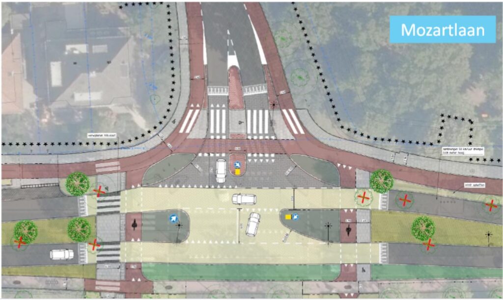Op de laatste avond is daar voorlopig het hieronder beschreven voorstel voor kruising Leidseweg-Mozartlaan uitgekomen (Die voor de Bach laan is identiek). Het wordt dan een verhoogde geel gemarkeerde kruising met fysieke maatregelen om 30 km af te dwingen. Ook komt er een brede middenberm en betere opstelmogelijkheden voor fietsers.